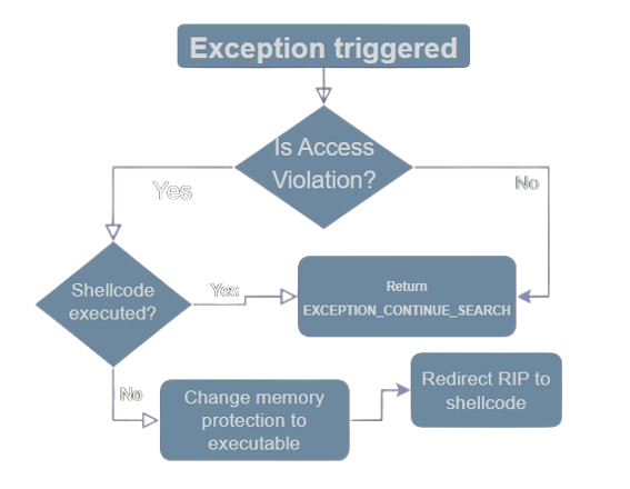 O VEH (Vectored Exception Handler) será configurado para capturar exceções do tipo EXCEPTION_ACCESS_VIOLATION, que vai ocorrer ao tentar executar uma região de memória marcada como não-executável.