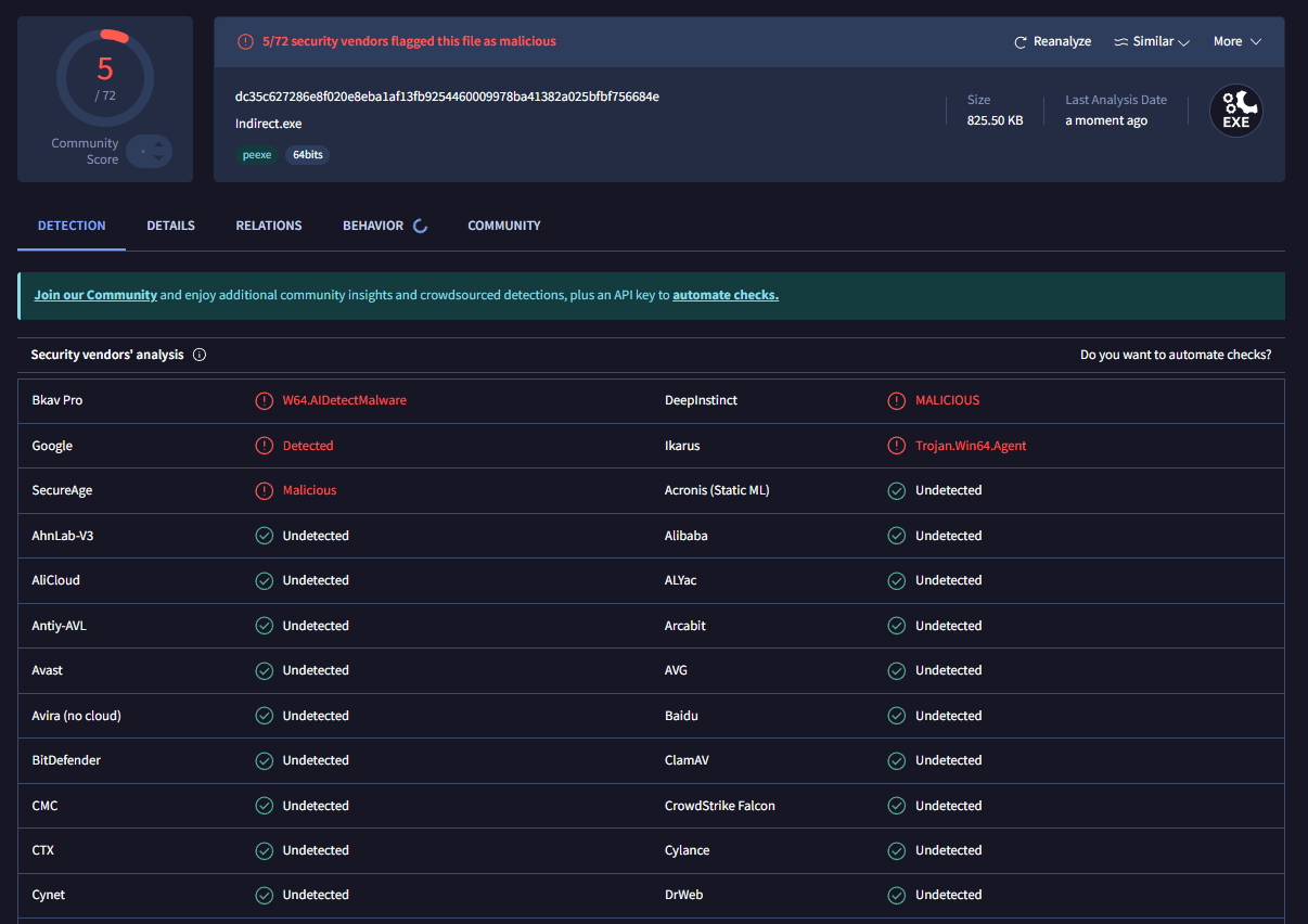 Obtive 5 detecções no VirusTotal. Não está muito bom, mas dá para melhorar: