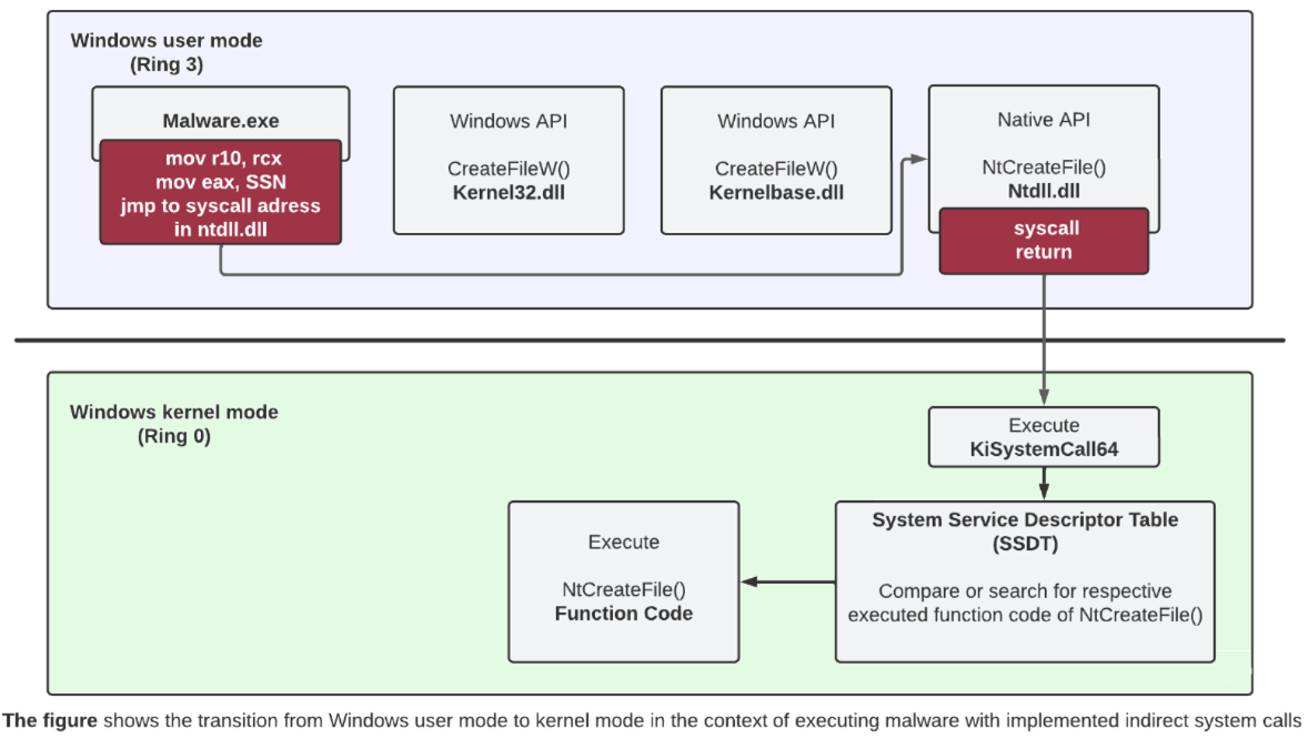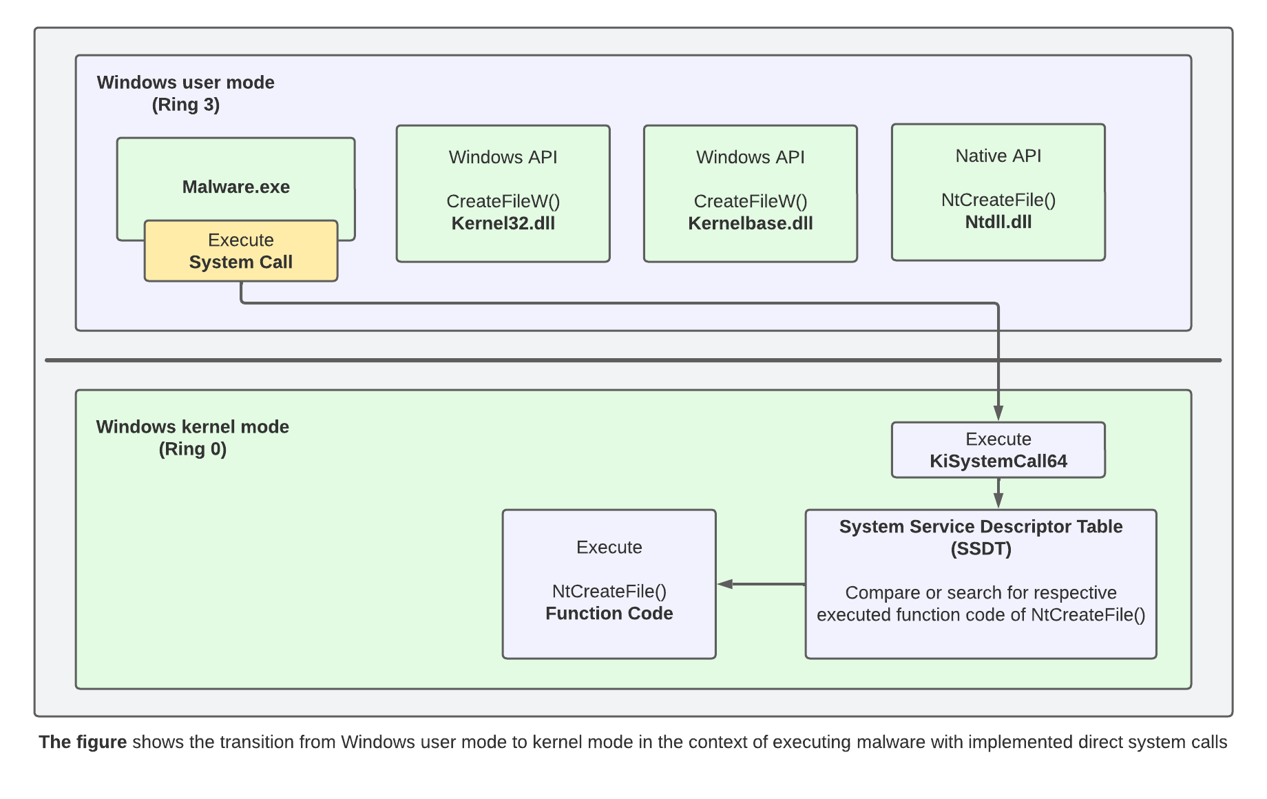 A figura abaixo mostra a transição do modo de usuário para o modo kernel no contexto da execução de malware com chamadas de sistema diretas implementadas.