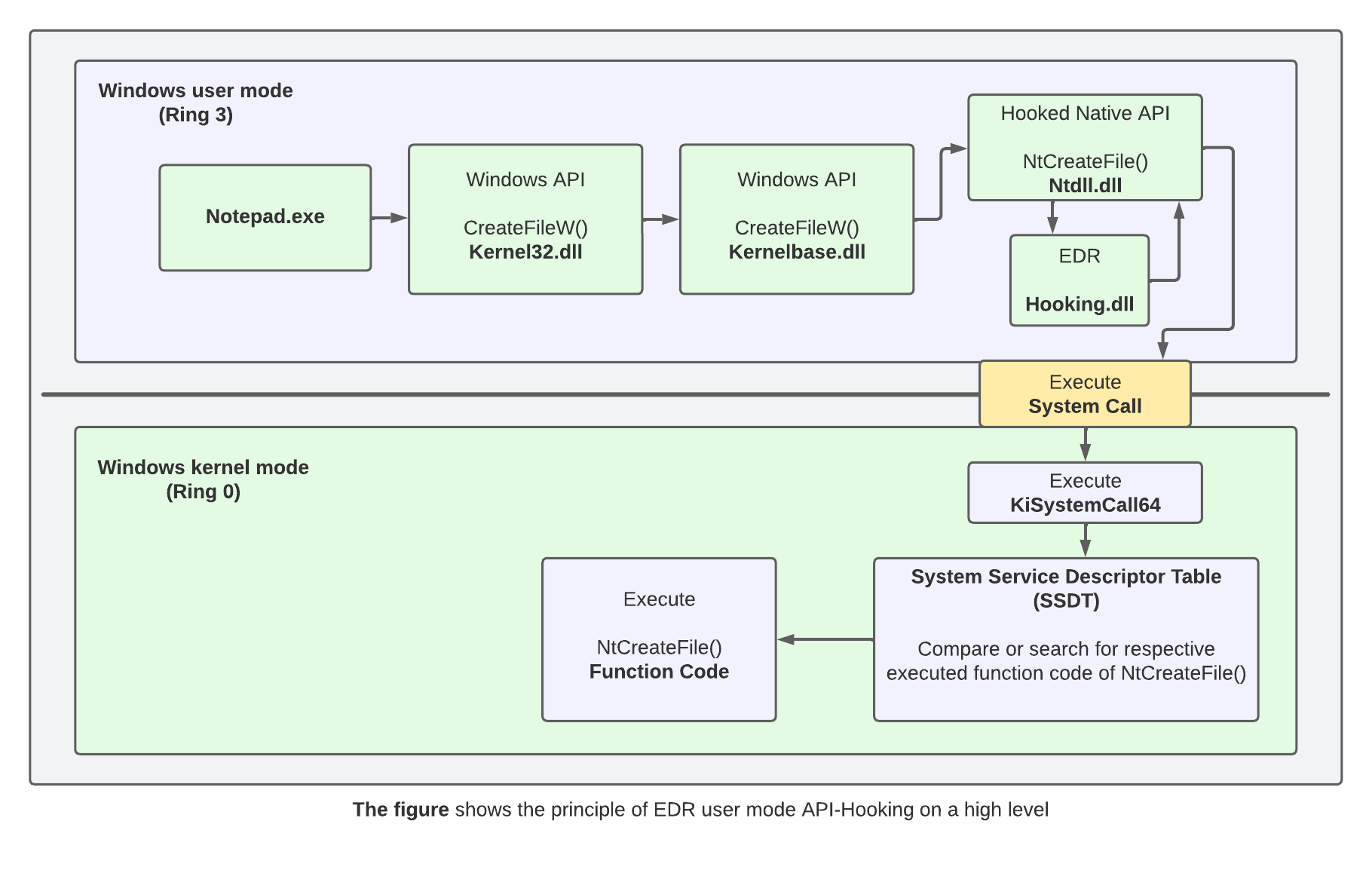 A figura abaixo explica como funciona um AV/EDR ao monitorar e interceptar chamadas de sistema.