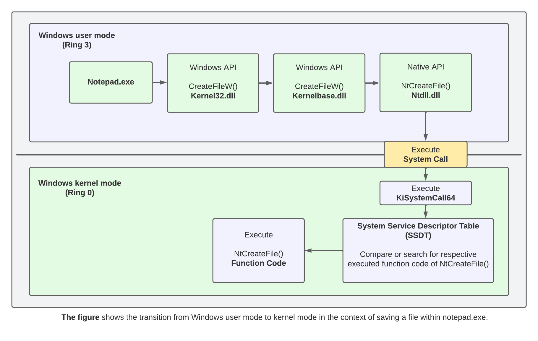 A figura abaixo mostra como funcionam as chamadas de sistema usando o exemplo do Bloco de Notas (notepad.exe). Quando o Bloco de Notas salva um arquivo, ele segue os seguintes passos: